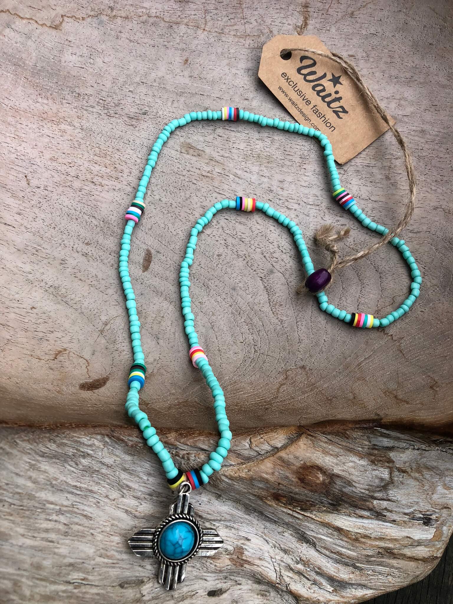 Waitz Design beaded bohemian necklace, handcrafted with exclusive WAITZ native indian antique silver pendant, combined with turquoise stone and original colorfull beads.