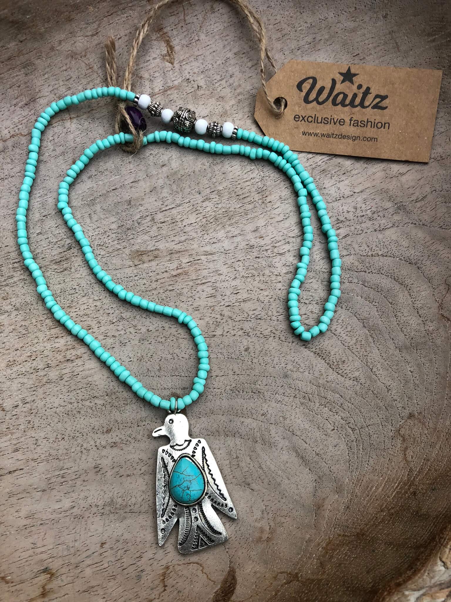 Waitz Design beaded bohemian necklace, handcrafted with exclusive WAITZ Thunderbird indian antique silver pendant, combined with turquoise stone and glass beads.